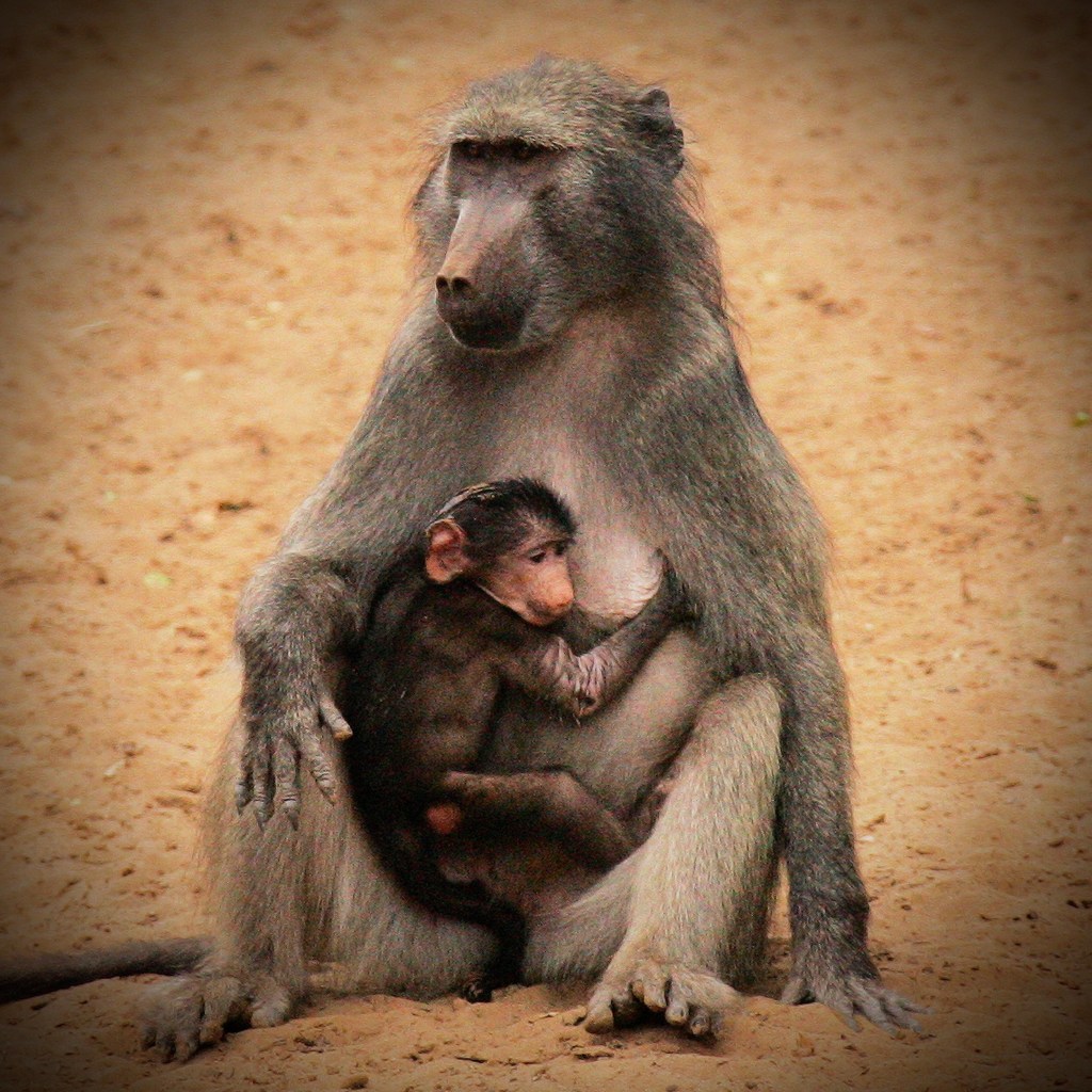 This is me and my mum. I am a Chacma Baboon. Do you know where we go to sleep at night?