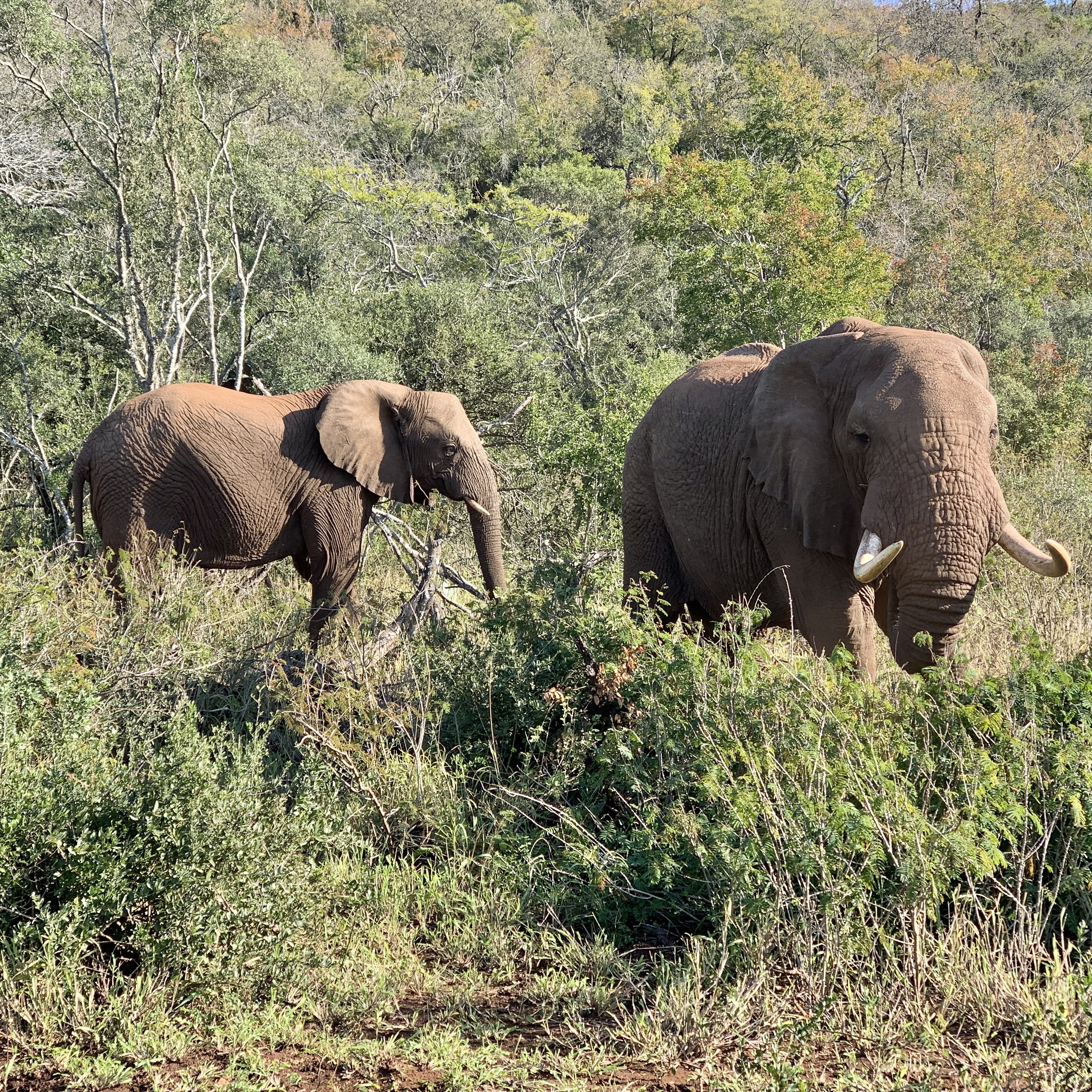 In this picture you see two adult Elephants. A female on the left and a male in the right. Can you name two features in the picture which make it possible to identify them as male or female?